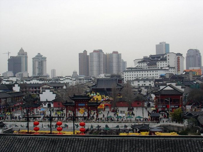 這是2006年2月24日的下午,站立于大石壩街北面某個建筑物的平臺朝北,可以俯瞰夫子廟,可以欣賞到上世紀八十年代中期建成的建筑群。正因為是冬天,沒有了繁枝茂葉,也就可以更好地觀看這建筑之美:中國建筑“以群體見勝”。 夫子廟的古典建筑群,既具有科舉教育機構(gòu)的統(tǒng)一形制,又具有地域文化特色。平面布局體現(xiàn)了傳統(tǒng)的“四方”概念。前廟后學的中軸線,向縱深發(fā)展——孔廟在前,學宮在后。貢院被布置在學宮的左側(cè)。